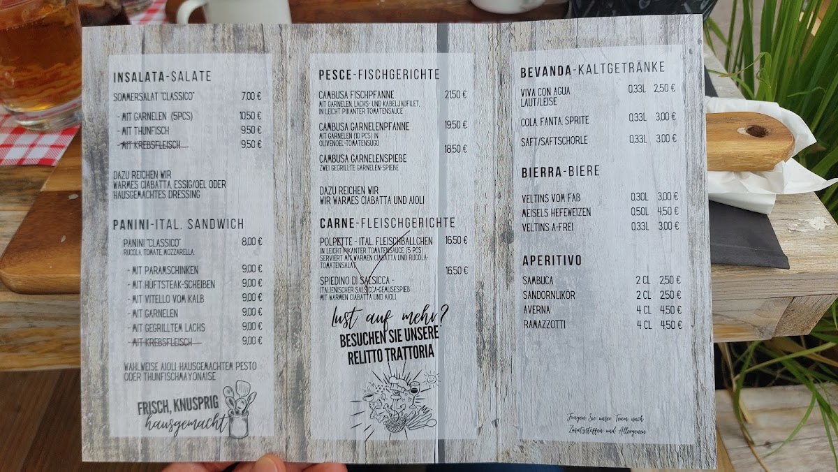 Relitto Trattoria Italiana’s menu leaves a lasting impression with its thoughtful balance of classic Italian flavors and fresh seafood highlights, making it a satisfying experience from start to finish. Standout dishes such as the delicate Carpaccio and fresh Oyster set a refined tone, showcasing quality ingredients with minimal yet effective preparation. The pasta offerings, particularly the Tagliatelle Mit Lachs, bring comforting richness with well-executed flavors, while the Garnelen Im Öl delivers a simple but aromatic seafood option that feels both rustic and indulgent. To round off the meal, the Panna Cotta provides a smooth and elegant dessert, perfectly capturing the essence of traditional Italian sweetness. Overall, the menu reflects consistency and care, offering a cohesive dining experience that blends freshness, authenticity, and satisfying variety.